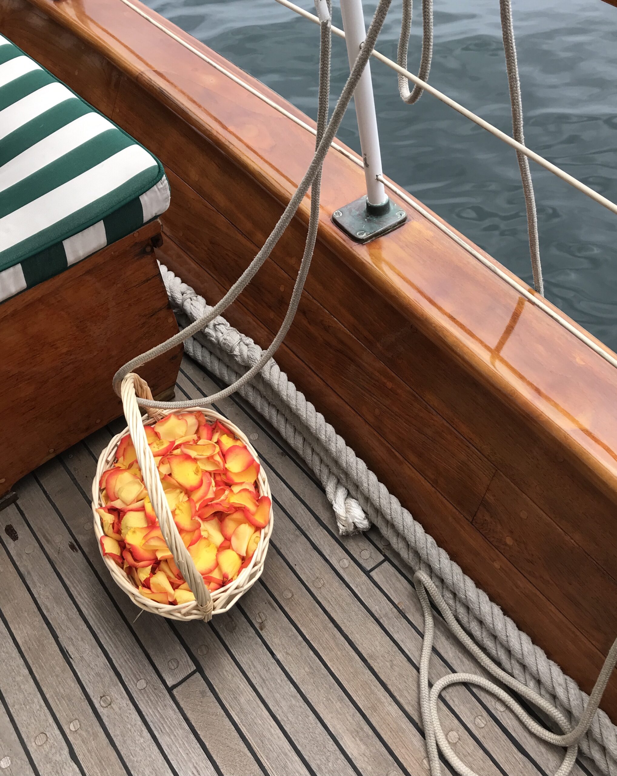 Before the ceremony begins, the crew carefully prepares a wicker basket lined and covered with flower petals (provided by the family), and places the cremated remains inside. At the appointed time, the crew helps prepare the line and guides the family through the lowering of the ashes into the sea.